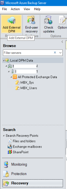 - Then open your Azure Backup Server console and go to the Recovery section to add an external DPM (as this is what is your Azure Recovery Vault)