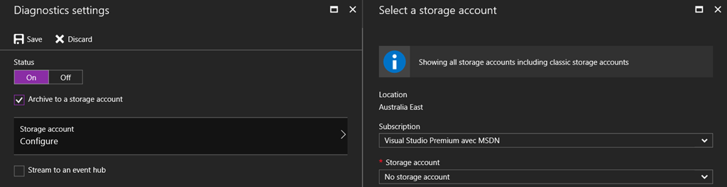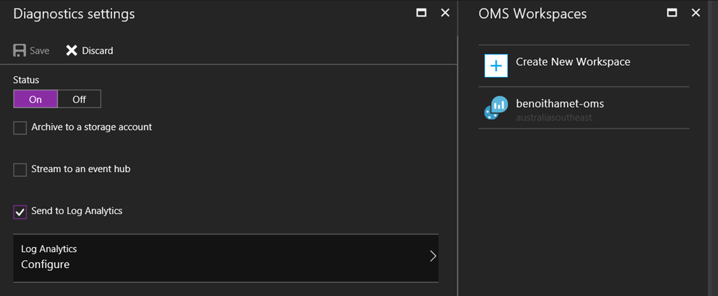 For this post I choose to use both a storage account and to send to my OMS workspace