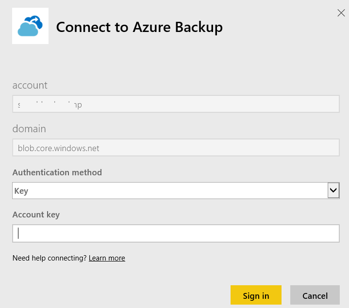 Then you need to define the storage account and the authentication method; the authentication method will be Key – you then need to gather the storage access key for the storage account from the portal
