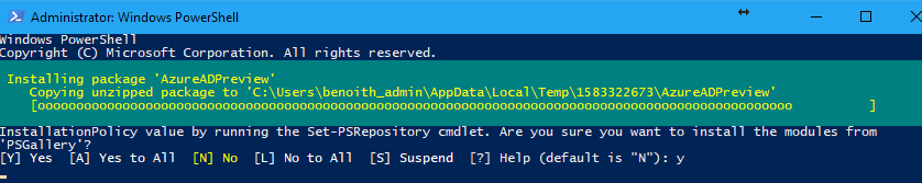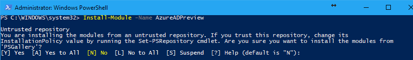 - Then you will have to confirm you want to install the AzureADPreview module from the repository; unless you already have set this repository as trusted