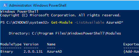 - Run a PowerShell command prompt using the runadadministrator and check the installed Azure AD PS module installed with the command Get-Module -ListAvailable AzureAD*