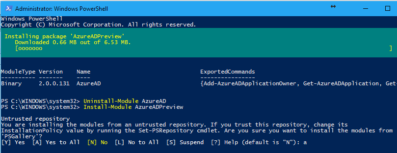 - If you have no result or after uninstalling the previous version run the command Install-Module AzureADPreview to install the required preview module; you may be prompted to trust the repository to download the module