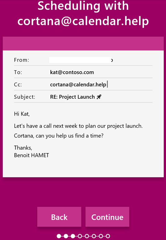 To use the new scheduling assistant, just send an email to your participant and add (in CC) Cortana using cortana@calendar.help