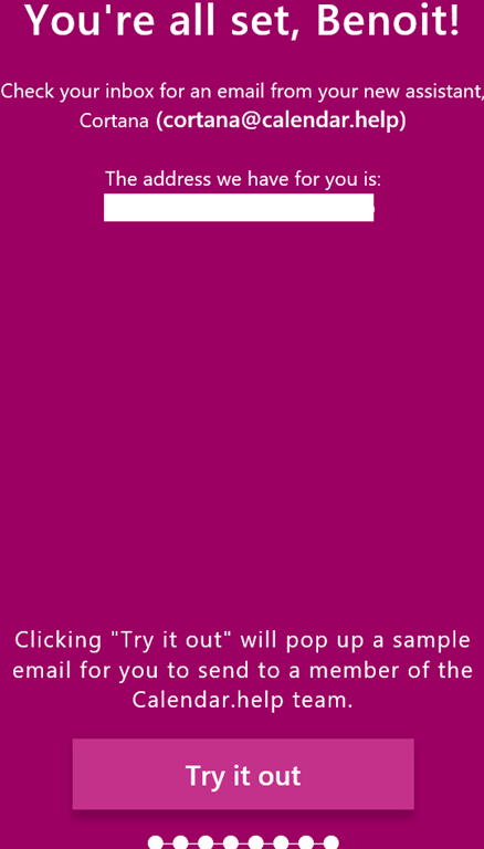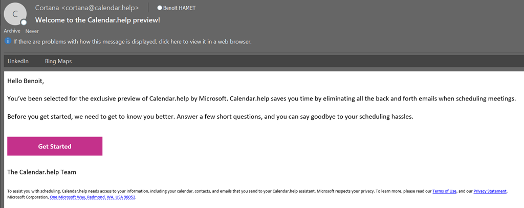 NOTE if you click the Try it out button, this will generate an automatic email being sent to Andres Monroy-Hernandez (@calendar.help – so Microsoft) to schedule a phone call; unless you want to do it, no need to click on this button ![]()