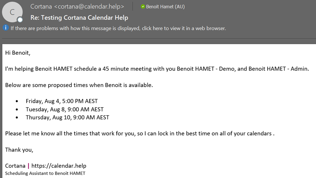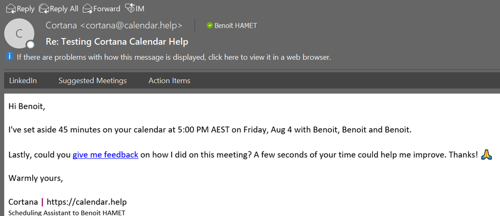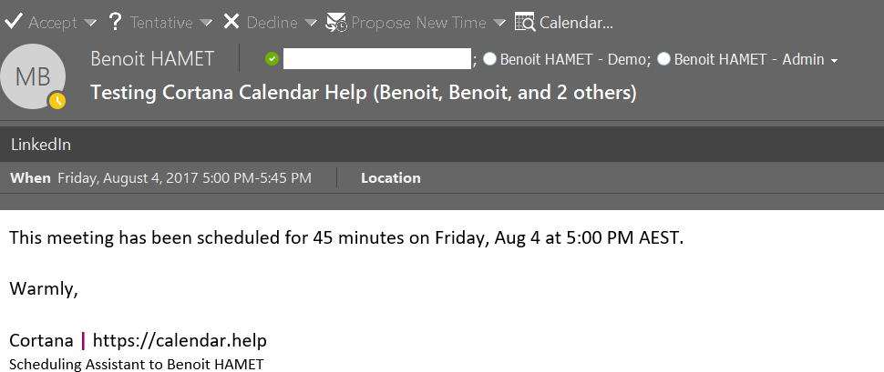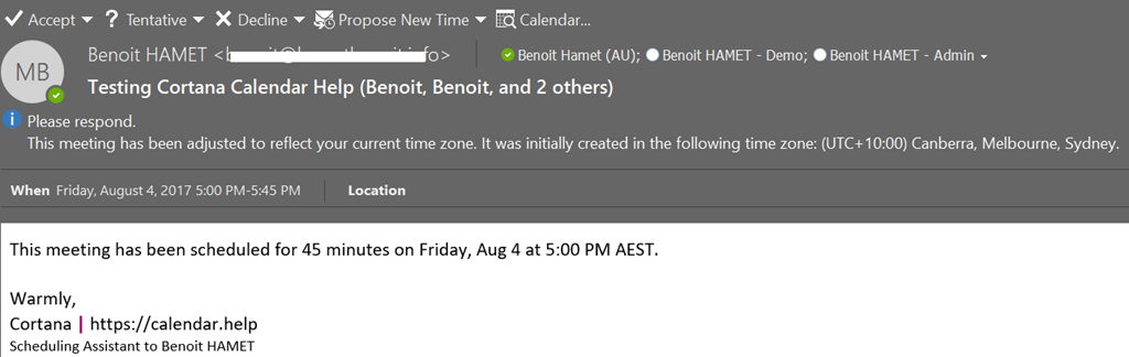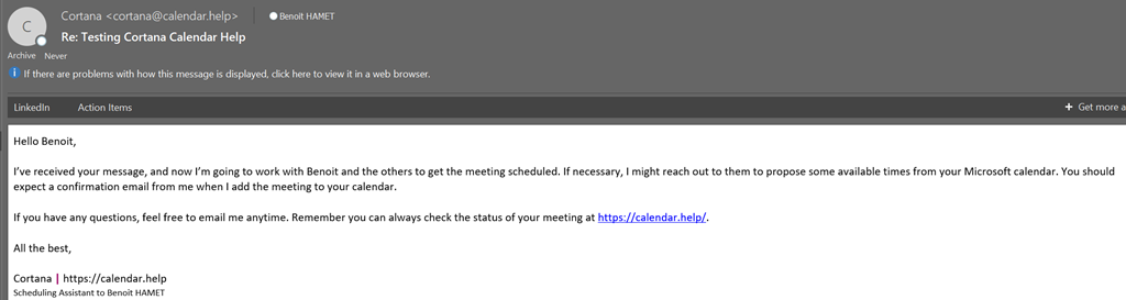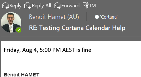 So it first I got my email (remember you do not have to use the request meeting message) on my recipients mailboxes and in the meantime got an email from Cortana telling me she is looking for availability