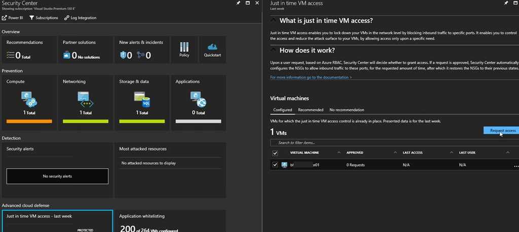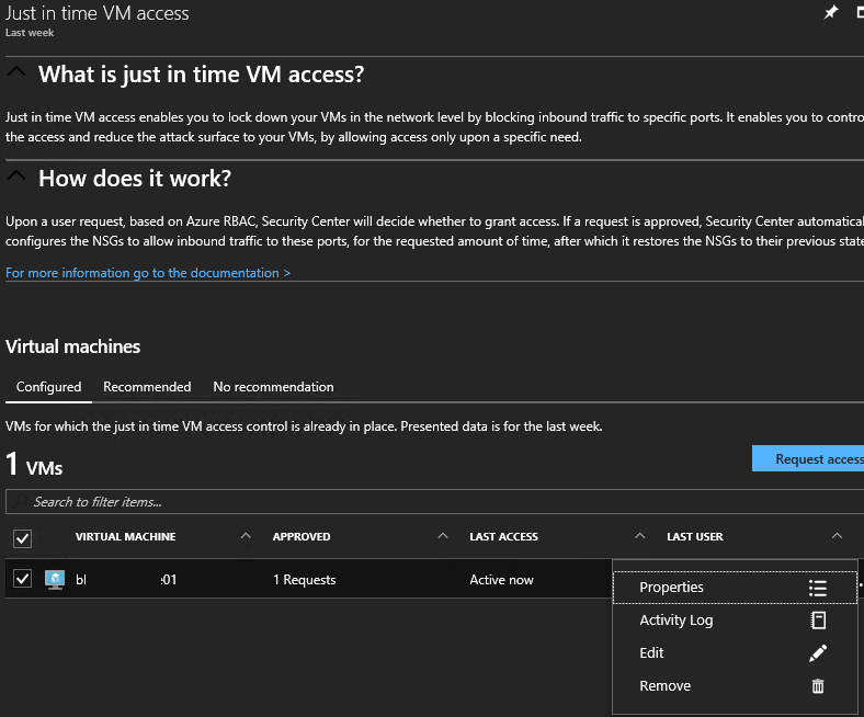 Once activated, the JIT Access blade will be refreshed showing the protected VM’s, with details regarding the number of requests including last user logged