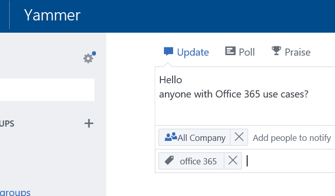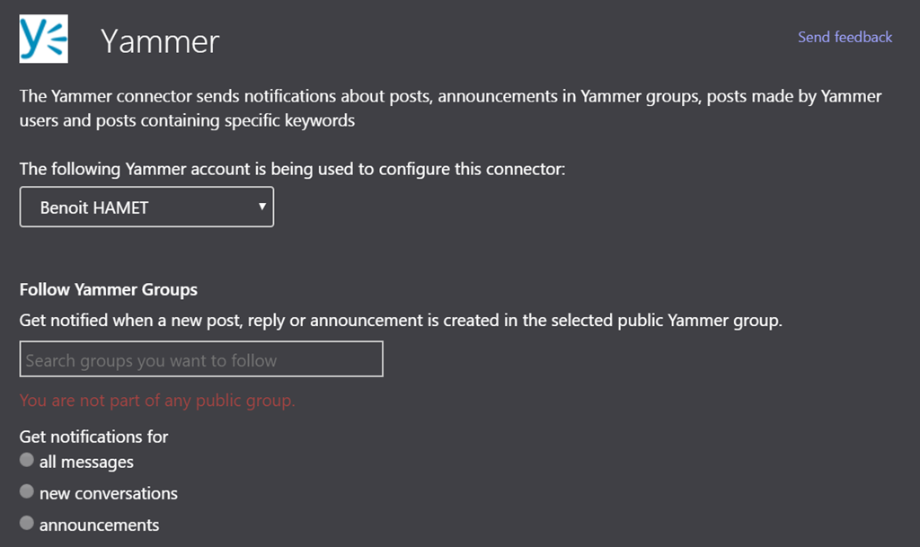 Then you can define the the Yammer group to grab the feed, the keyword you want to get notified… Keep in mind this must be a public Yammer group if you want to grab a specific Yammer group