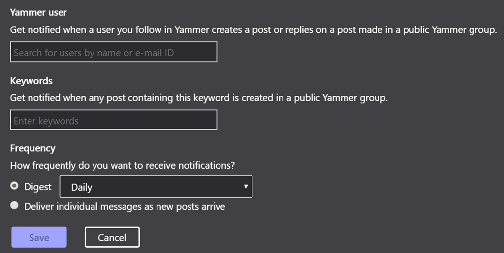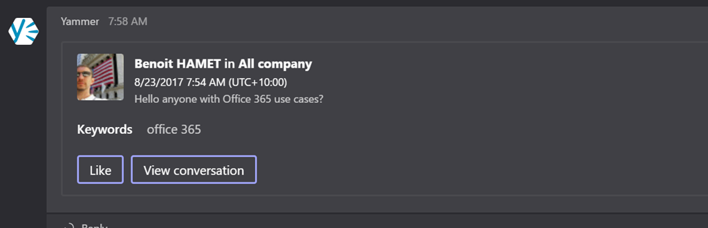 And you can reply directly from Team back to the Yammer conversation but this will be only in Teams; your reply from Teams will not be published back to Yammer