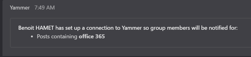 You will also get a notification to the channel to tell everyone a connector to Yammer has been setup with the configuration applied – in this example I’m looking for the keyword Office 365