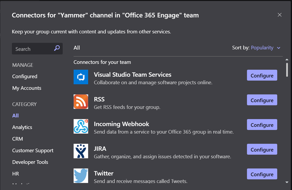 Teams comes with lot of out of the box connectors – or you can also develop you own ![]()
