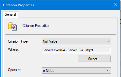 - Finally you can create the device collection using the registry key; the query will be ServerLevels64 – Server_Gui_Mgmt is NULL
