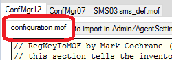 - Edit with notepad the configuration.mof file and reach the end of the file to locate the section