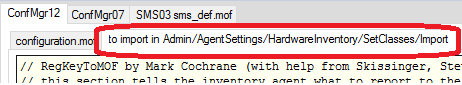 - Next copy the code generated in the to import in Admin/AgentSettings/HardwareInventory/SetClasses/Import tab to a new text file you will save as .mof; save it to an accessible location to import it using the SCCM console