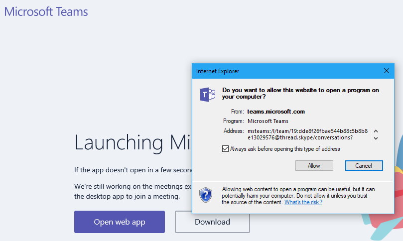 When clicking Next the Teams is preparing your access and then ask to launch either the web app or the Teams app if installed (if not you get the link to download it)