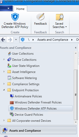 Using SCCM console, go to the Assets and Compliance workspace and open the Endpoint Protection\Windows Defender ATP Policies section
