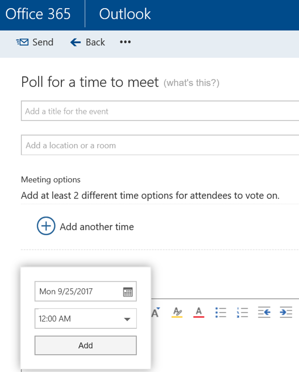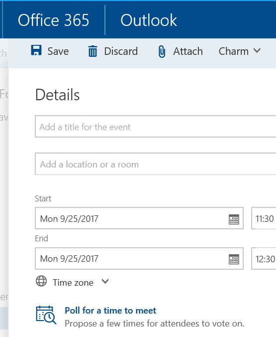 Now FindTime is getting easier to use with Outlook on the Web (or OWA) by getting available directly (without using the add-in) when you create a new meeting request (or calendar event as it is called on OWA)