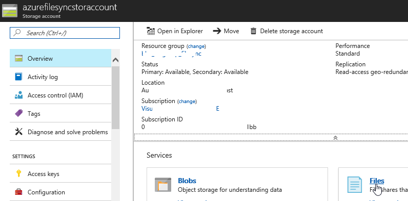 Access the storage account you want to use for the Azure File Sync service and access the Files service from the Overview blade
