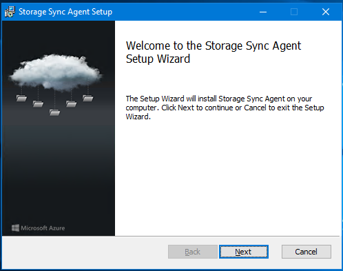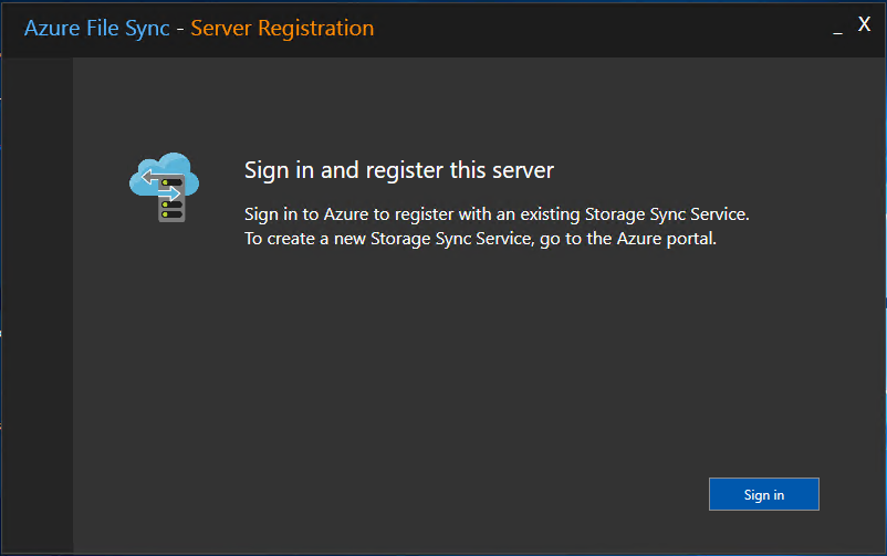 Once the installation of the agent is completed, the registration wizard must come up automatically; if not just start the wizard manually by executing ServerRegistration.exe from the installation folder (default is C:\Program Files\Azure\StorageSyncAgent)