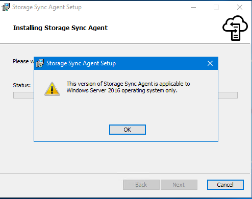 NOTE you may have to run the installation using an elevated command prompt if you get a pop up saying “This version of Storage Sync Agent is applicable to Windows Server 2016 operating system only” while the operating system is already Windows Server 2016
