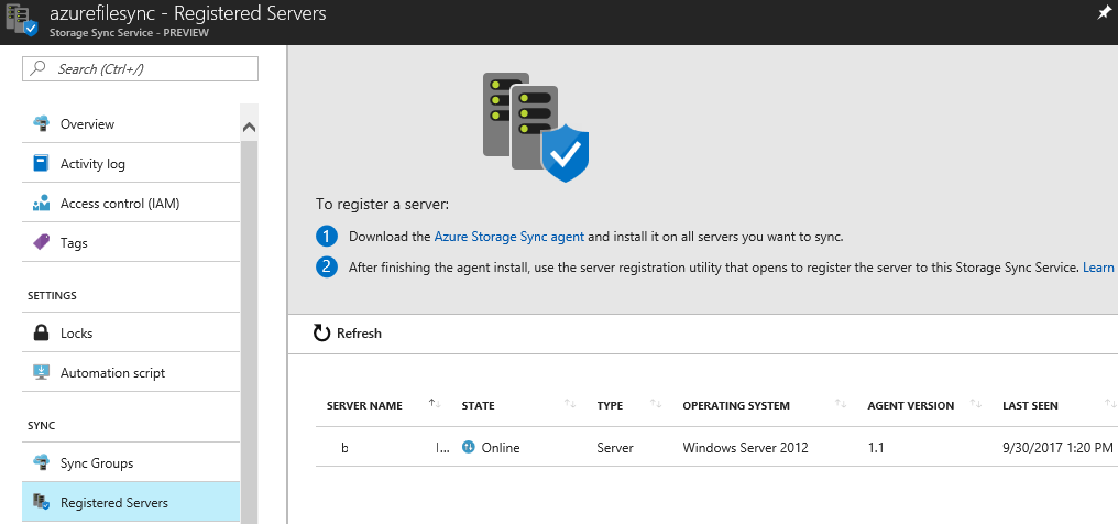 Once completed the server will be displayed in the Azure File Sync\Registered Servers blade