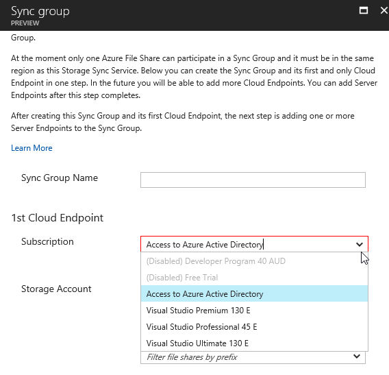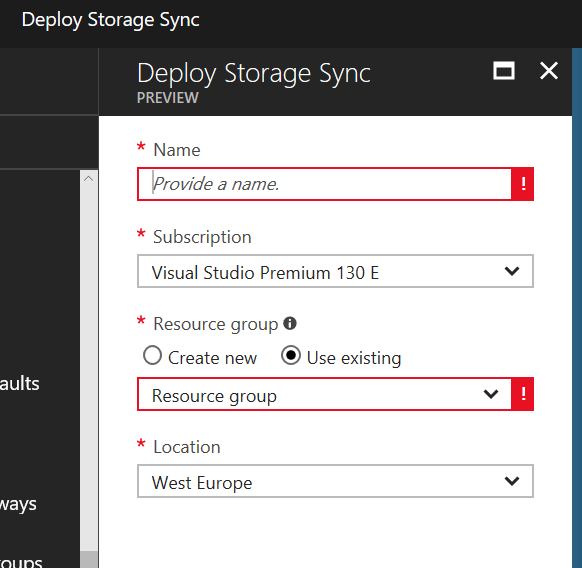 After accessing the Storage Sync blade using the link provided above you just have to name it and define the location/resource group and subscription associated with