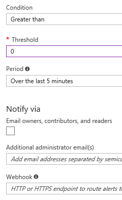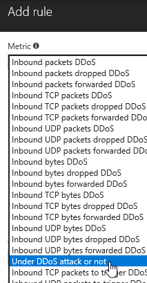 Name the new alert and select the metric Under DDoS attack or not and set the condition to greater than 0 over the last 5 minutes (as this is the least timeframe available) and finally set your actions from sending a notification email to run a webhook