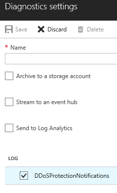 You can then define where to save the logs, from storage account to Log analytics and select DDoSProtectionNotifications