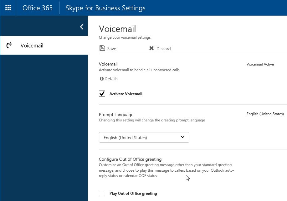 From there you can enable/disable voice mail and configure language or Out of Office greetings