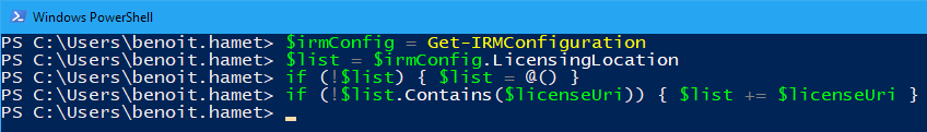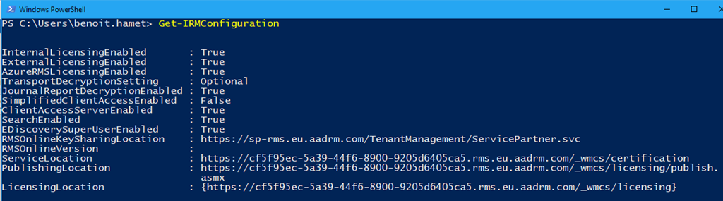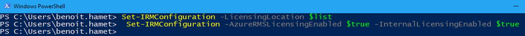 - Apply the IRM configuration if required; NOTE only the command Set-IRMConfiguration -AzureRMSLicensingEnabled $true is required if you already had it configured with Azure RMS