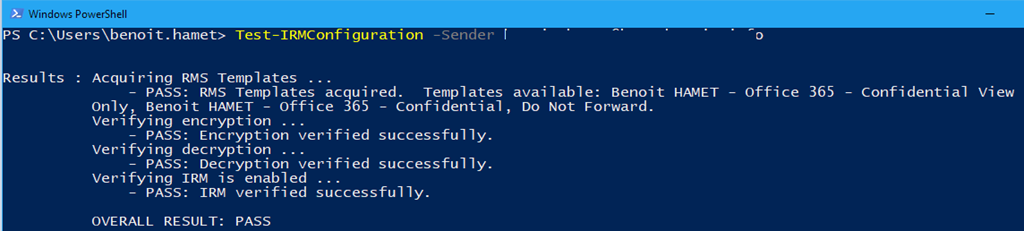 Test-IRMConfiguration –Sender <email address of a user enabled for Azure IP>