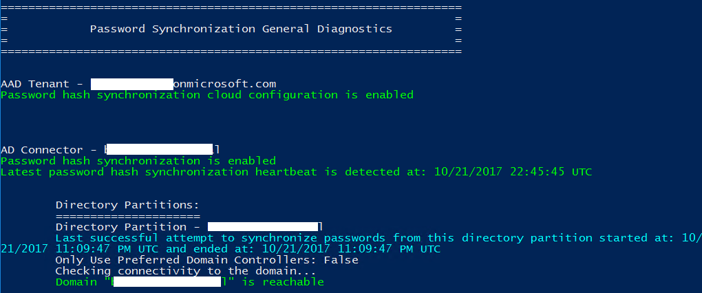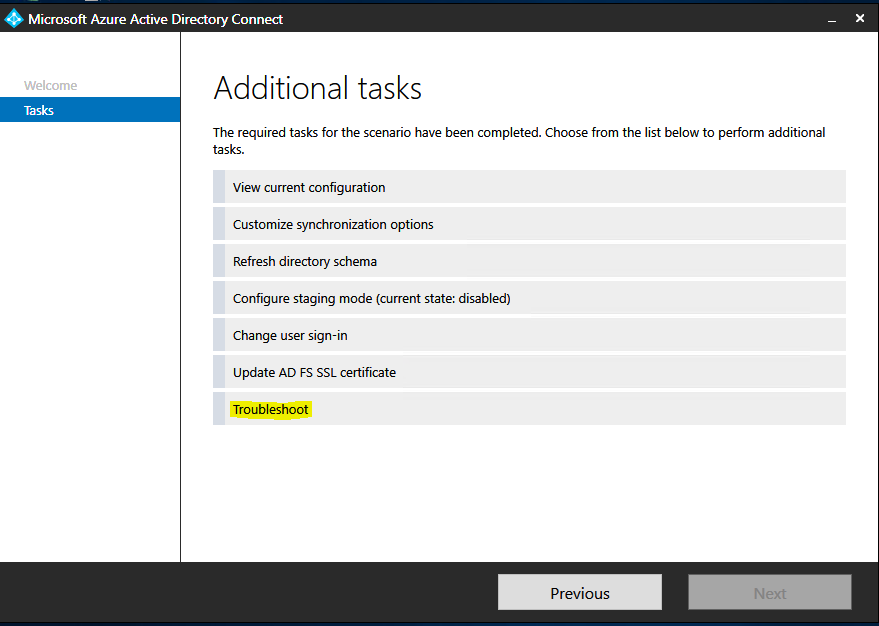 - Get general diagnostic which will generate a diagnostic report saved in the C:\ProgramData\AADConnect\ and named AADConnectDiagnostics-<date and time of exection>.txt with configuration details, like features enabled or additional attribute(s) synched