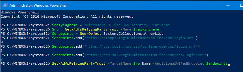 - Set-AdfsRelyingPartyTrust -TargetName $rp.Name -AdditionalWSFedEndpoint $endpoints