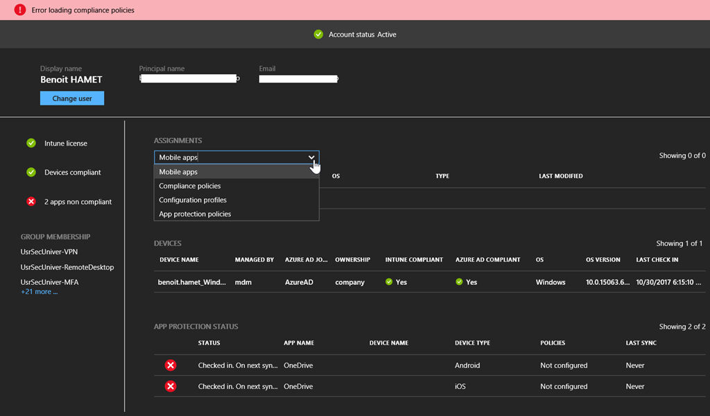 As result the troubleshooting assistant is confirming if the user is licensed or not, all the devices registered and the detected issues; you can then also filter by selecting which specific configuration you are troubleshooting using the Assignments drop down menu