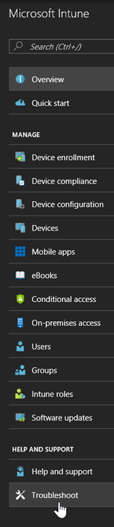 - or through the portal by searching for Intune and go to the Help and Support\Troubleshoot section