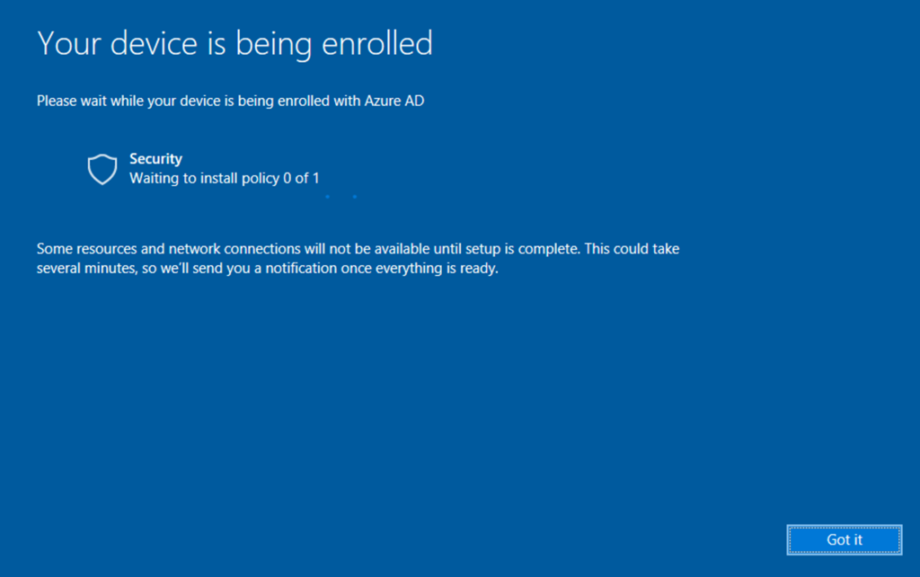 Once saved, this will be applied to all new device being enrolled with your Azure AD; showing your greeting (title – here in the screenshot ‘Your device is being enrolled”), your message (here ‘Please wait while your device is being enrolled with Azure AD) and the current progress of policy(ies) installation