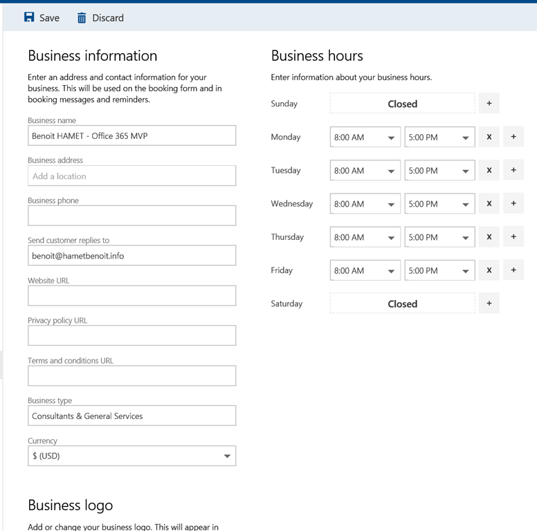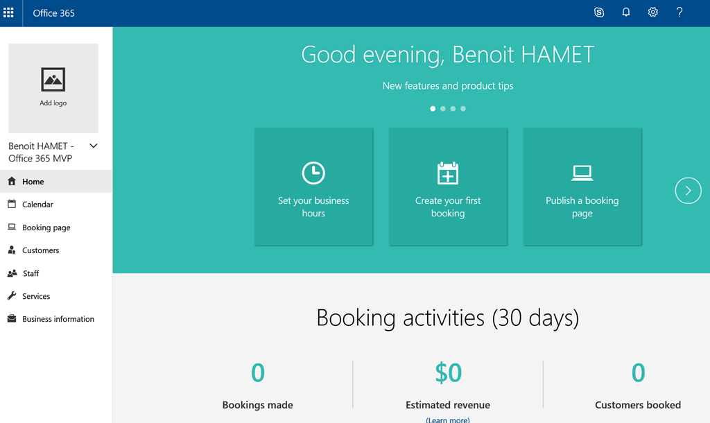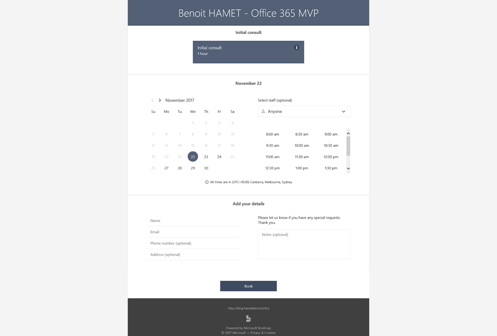 NOTE the Booking page URL contains your Office 365 tenant as this uses the format https://outlook.office365.com/owa/calendar/<your business name/title>@<your tenant – like mytenant.onmicrosoft.com/bookings/