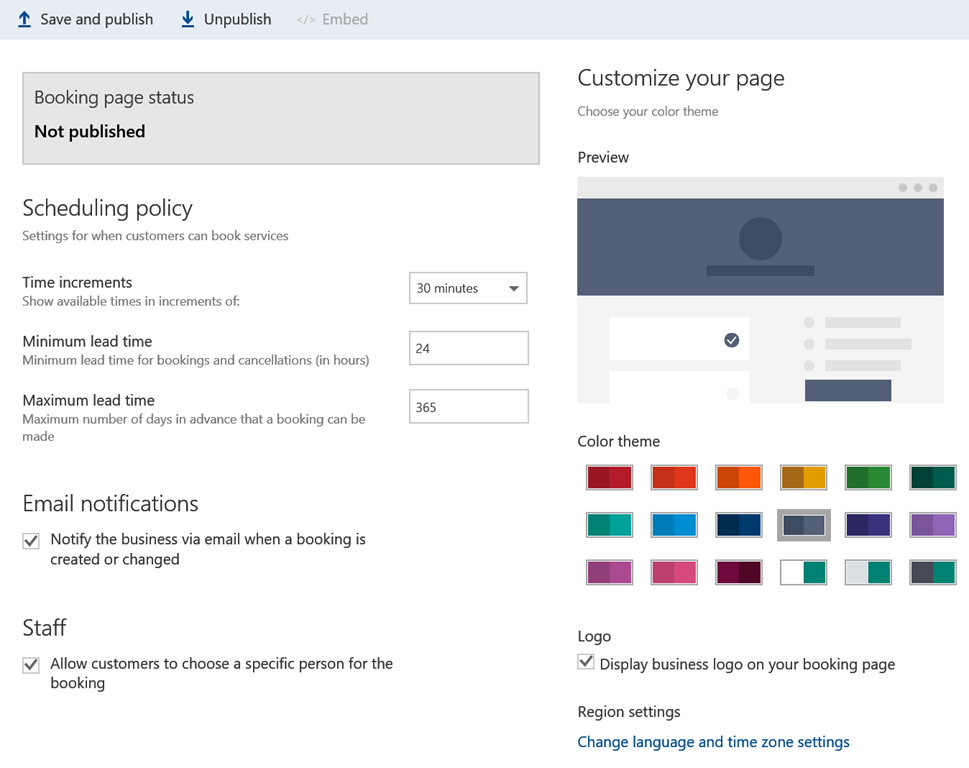 You can then configure the few settings for the booking page like who to notify, time increment or color theme