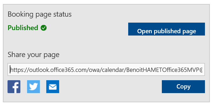 Once you click Save and publish you will get the Booking page’s URL, you can then share using Facebook Twitter or email