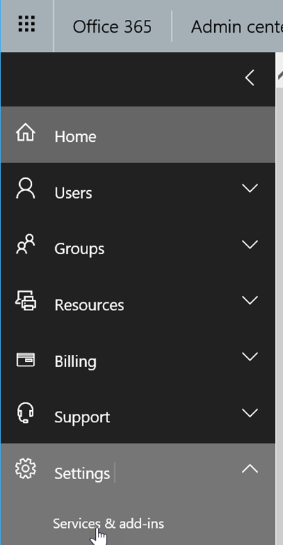 Logon to your Office 365 Admin Portal and reach the Settings\Services 7 add-ins section