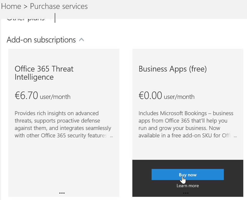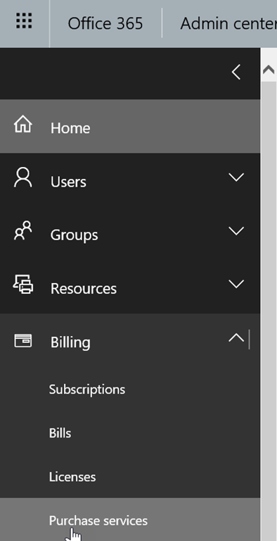 Still on the Office 365 Administration portal, access the Billing\Purchase Services and search for Business Apps (this is located below the Add-On subscriptions section)