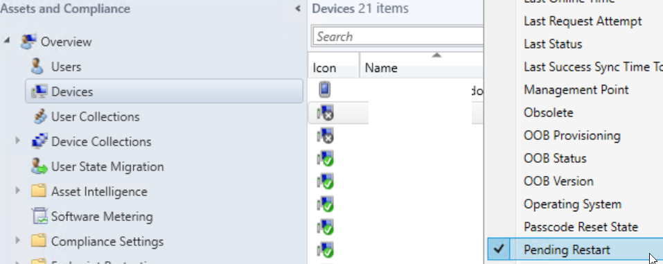 Now with SCCM, it becomes easier. The latest update for SCCM Current Branch (build 1710) has a new column to use in the Console\Devices to identify such devices with pending reboot