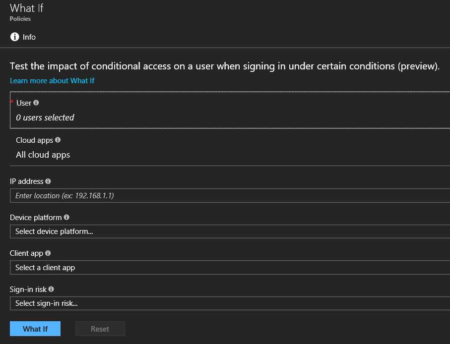 When using the What If functionality, you can then select a user account (mandatory) you want to use for testing (meaning no need to ask this user to logon and try to access), the cloud application (optional) you want to evaluate the Conditional Access, IP address (optional) from which you are going to try to access the application, a device (optional), a client application (optional) or the sign-in risk level (optional)