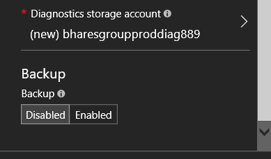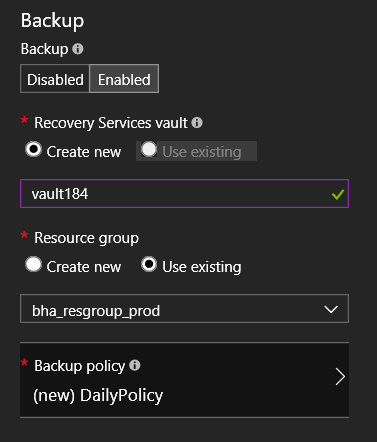 By default, the backup option is Disabled; when you enable it, you will then define the Recovery Service Vault to use and create the policy (or select one if already exist)