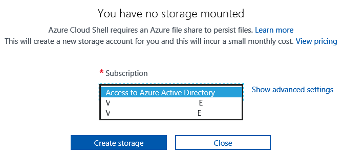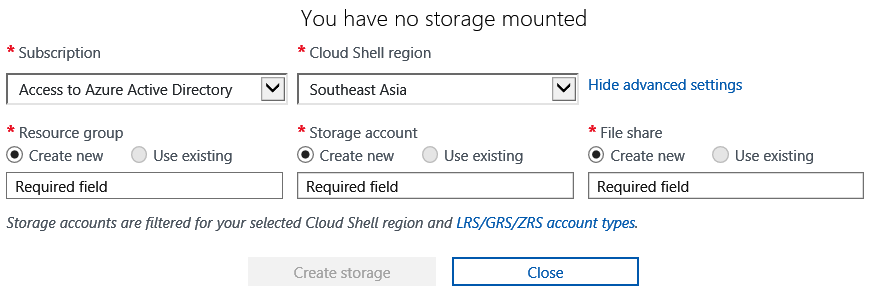 If this is the first time you are accessing the Azure Shell, you will be requested to create a storage account used to save the temporary files generated.