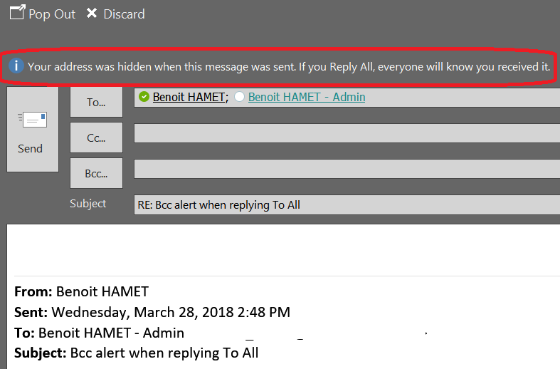 The Outlook version coming with the Office Click To Run is now showing a notification when a blind carbon copy (Bcc) recipient is reply to all.