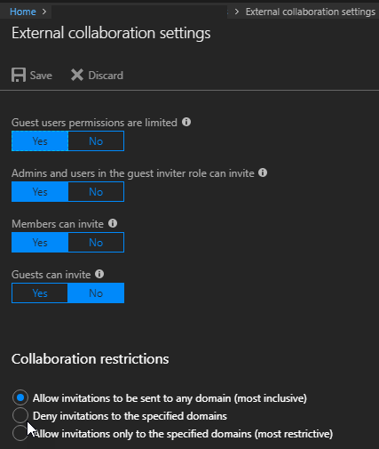 From this configuration blade you will find the already well known guest management options (permissions, who can invite…) but also the new External Collaboration Policy under the Collaboration Restrictions