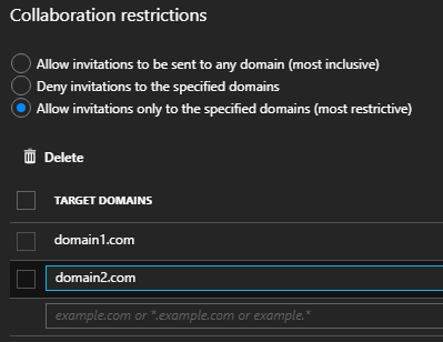 Then if you enabled one of the restriction options you will be able to define the domain you want to authorize/block the external sharing with.