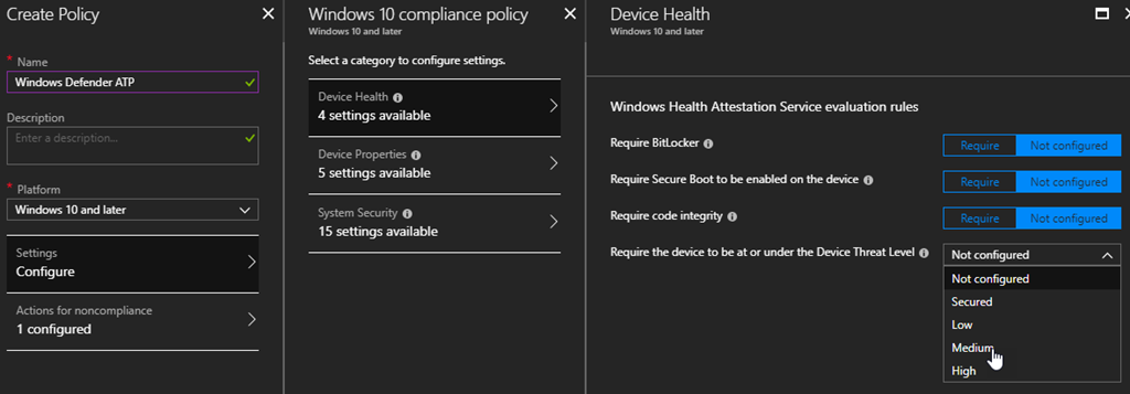 To use Windows Defender ATP in your conditional access, go to your Azure ARM portal (https://portal.azure.com) and access your Intune\Device Compliance configuration blade
