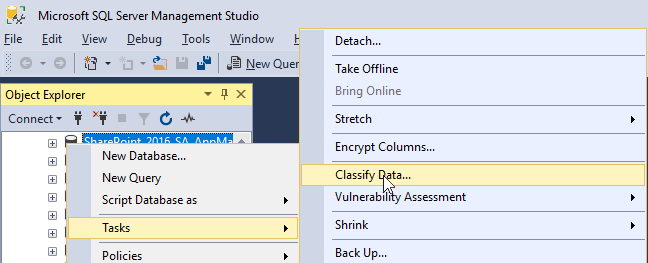 - Right click on the database you want to use the data classification and choose Tasks\Classify Data