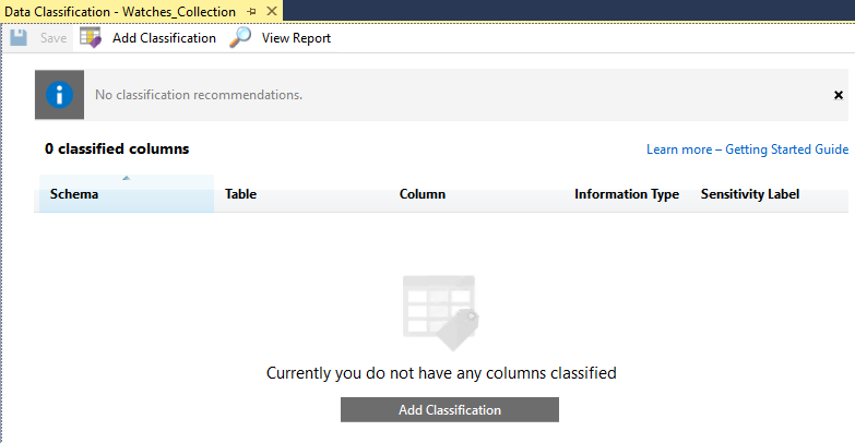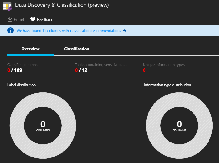 Once enabled you will be able to access the dashboard from the SQL database’s Data Discovery & Classification blade and then by opening the Data Discovery & Classification section